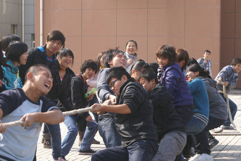 随后,公司党总支书记冯利沙老师宣布拔河比赛正式开始。根据比赛规则,2010级新生按照班级进行抽签分组,由公司各位领导老师、辅导员及员工会干部则担任裁判。比赛前,同学们各个摩拳擦掌,精神抖擞。随着一声哨响,只见对垒双方成员紧握绳索,双脚紧紧地踏着地面,身子下蹲后仰,两眼目视前方,铆足了劲向自己方向拉,平时斯文的女孩子们,这时也流露出了几分“彪悍” 和“野性”,紧绷的脸也少了平日的轻松,多了几分竞争的严肃,为比赛增添了几分火爆。双方啦啦队的队员们则齐声呐喊“一,二,加油……”,六艺楼广场上充斥着一片震耳欲聋的呐喊助威声和隆隆的擂鼓声。比赛吸引了其它院系同学的驻足观看,一位路过比赛现场的外教也饶有兴致地当起了观众,最后在公司员工会的邀请下,还兴致勃勃地吹起了哨子,当起了比赛裁判,整个比赛现场热烈而火爆。